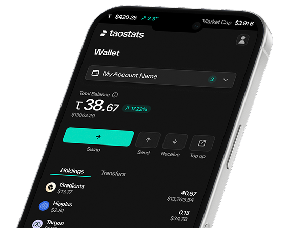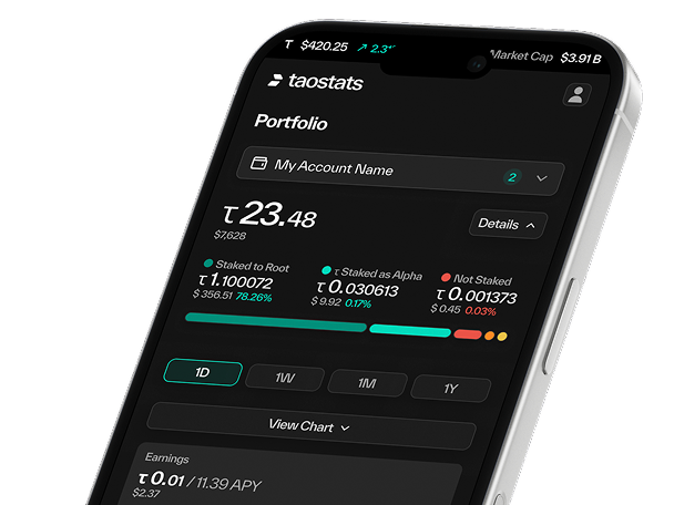 Get real-time insights into your TAO holdings. View staking rewards, subnet earnings, and portfolio growth — all in one clear, secure dashboard.